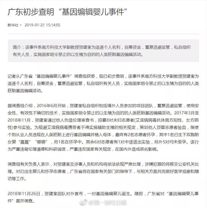 基因编辑婴儿 事件调查结果公布 贺建奎追逐个人名利 凤凰网